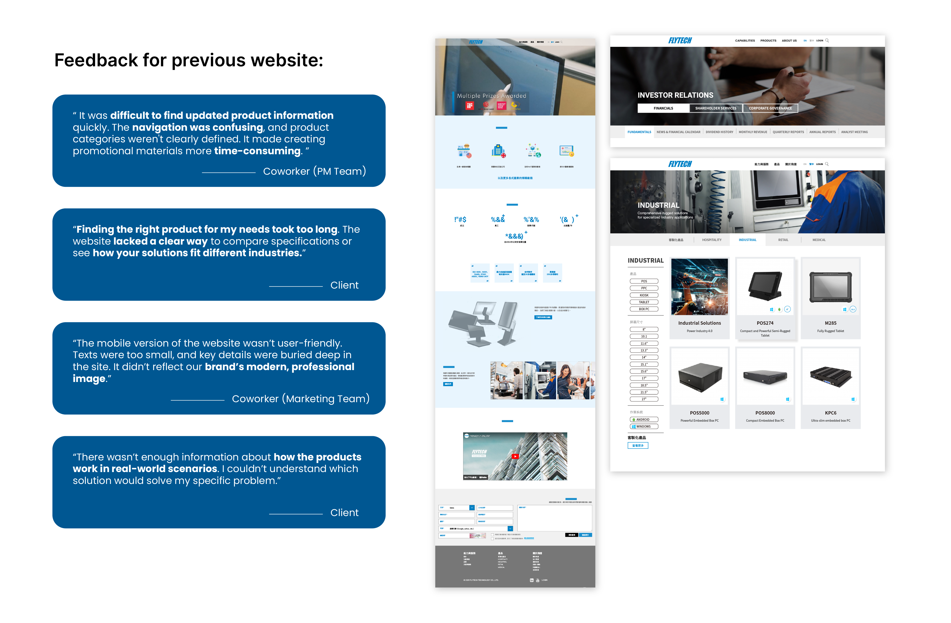 The original Flytech website had a cluttered structure, unclear product categories, and visuals that failed to represent the brand’s innovative identity, making navigation frustrating and the overall experience feel outdated.